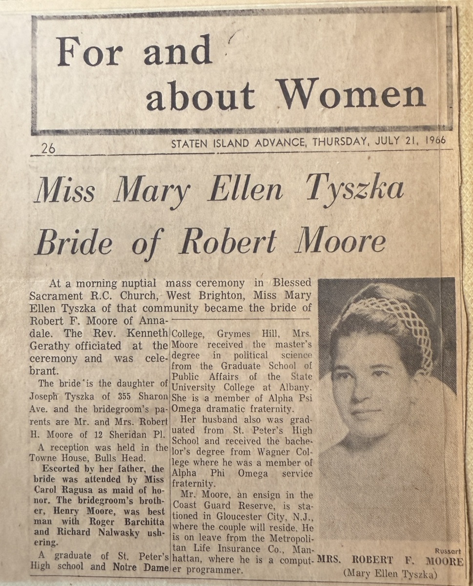 In 1966, Mary Ellen married Robert (Bob) Moore, of Staten Island, New York. Mary Ellen adored her husband and considered him her best friend. Mary Ellen and Bob had five children – Tom, Joe, Meg, Dan, and Katie. Their house was usually loud with laughter, political debate, and their barking corgi, Daisy.